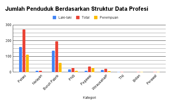 Profesi terbesar adalah Petani 👨🌾 (271 orang), terdiri dari 159 laki-laki dan 112 perempuan.